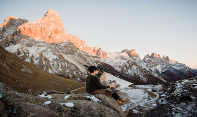 Silvia De Bastiani (Feltre, 1981) vive e lavora nella valle del Primiero, tra le Dolomiti trentine. È tra le più raffinate interpreti del paesaggio alpino contemporaneo, realizza acquarelli monumentali dipinti en plein air, spesso in condizioni estreme, che offrono allo spettatore un’esperienza avvolgente e multisensoriale: la pittura diventa un luogo dove si depositano luce, temperatura, silenzio, odori e vibrazioni raccolti nelle lunghe ore trascorse in montagna. Nelle sue opere, la montagna non è solo soggetto, ma linguaggio identitario. Le Dolomiti, le cime venete e trentine, ma anche le Alpi lombarde, piemontesi, valdostane e svizzere diventano materia viva, colta con un approccio quasi scientifico alla morfologia, alla geologia, alla vegetazione e ai mutamenti atmosferici.